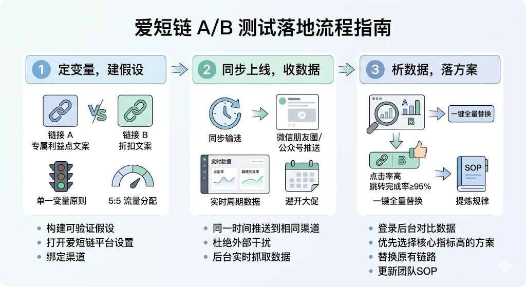 确认配置无误后,同一时间把两组短链推送到相同渠道(如同一朋友圈、公众号推送),确保投放时间、受众群体完全一致,杜绝外部干扰。 通过爱短链后台实时抓取点击率、跳转完成率等核心数据,测试周期建议覆盖完整业务周(7天),避开618、双11这类大促节点,数据才靠谱。