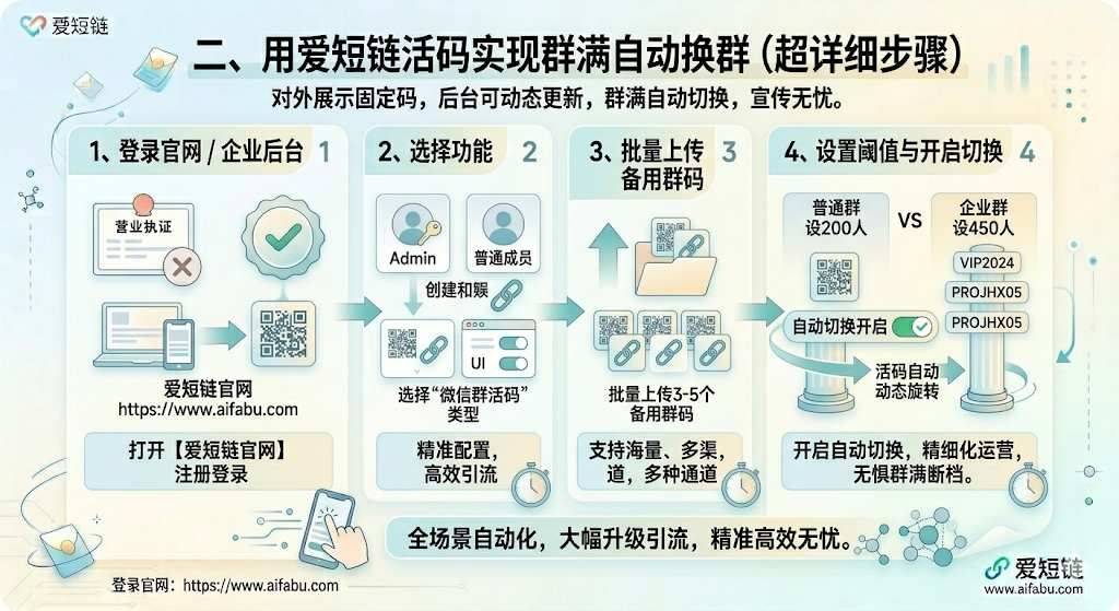 爱短链活码对外展示固定码,后台可动态更新群二维码,群满自动切换备用群,无需重复更换宣传物料,还能实时统计扫码数据、支持精细化运营。