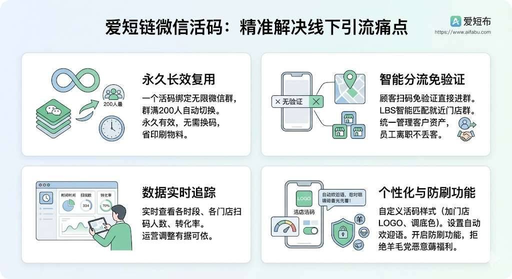 线下门店私域引流总踩坑?海报码刚印就失效、高峰手忙脚乱漏客、连锁门店匹配错群、运营策略全靠猜?试试爱短链微信活码(j9九游会真人游戏第一官网:https://www.aifabu.com),长效复用、智能分流、数据追踪,帮你把到店客流变成高复购私域用户,转化率直接拉满!