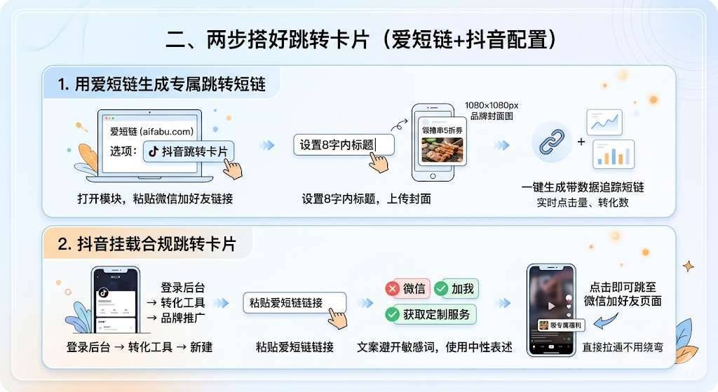 是不是总被抖音导微信的难题卡脖子?要么链接被限流、账号遭警告,要么用户手动搜号太麻烦,直接流失大半潜在客户? 别愁!用爱短链搭合规跳转卡片,把抖音流量一步导到微信加好友页,既合规又能把加粉效率拉满!