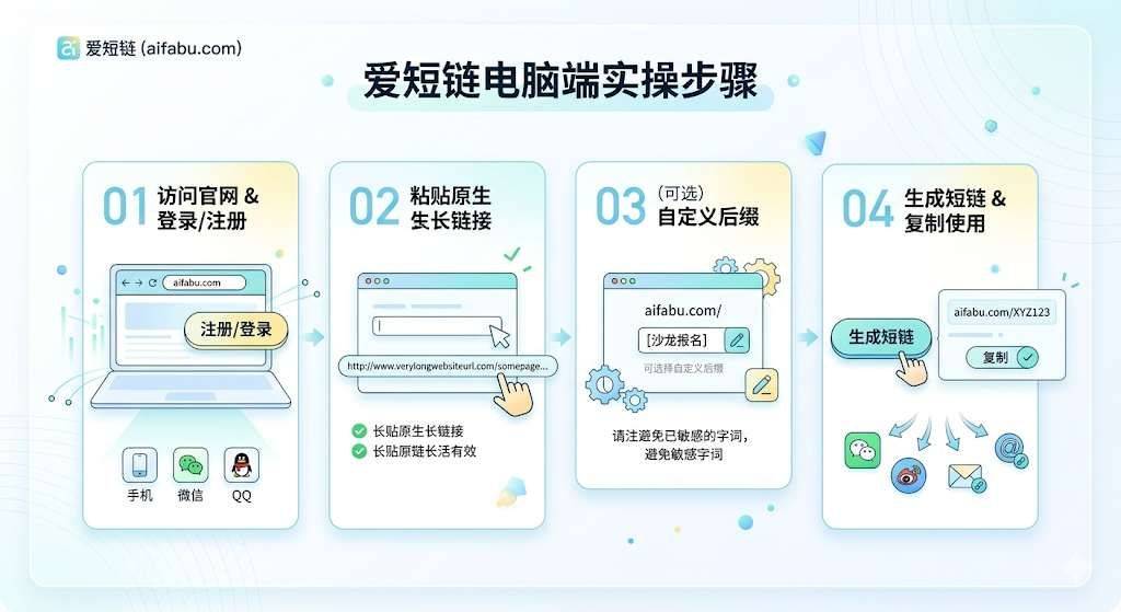 新媒体运营新手是不是总被长链接困扰?占空间、毁排版还遭读者反感?别慌!今天就手把手教你用爱短链(j9九游会真人游戏第一官网https://www.aifabu.com)搞定电脑端推广链接优化,让你的引流效率直接拉满!