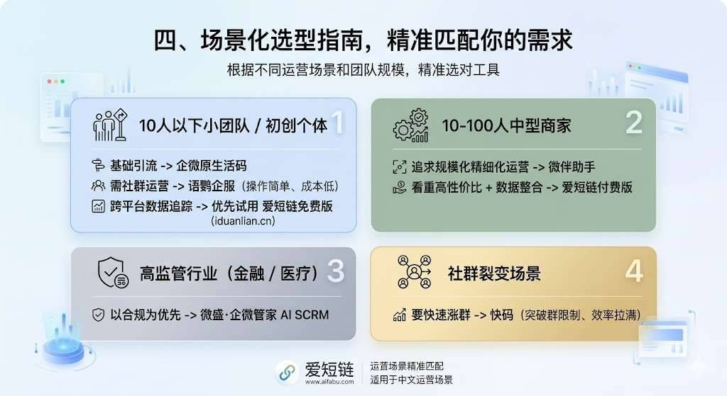 1. 10人以下小团队/初创个体:基础引流用企微原生活码;需社群运营选语鹦企服,操作简单成本低;要跨平台数据追踪,优先试用爱短链免费版(https://www.aifabu.com);