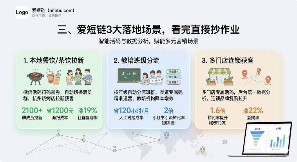 用爱短链微信活码设置「扫码入群领5元抵扣券」,满员自动切换新码。杭州某社区烧烤店30天拉新2100 群成员,省了3次换海报的1200元成本,社群复购率还涨了19%!