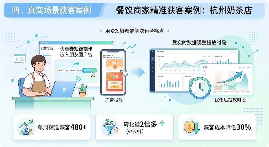 餐饮商家精准获客案例: 杭州一家奶茶店用爱短链制作优惠券短链嵌入朋友圈广告,靠实时数据调整投放时段,单周精准获客480 ,转化量是之前发长链的2倍多,获客成本直接降低30%。