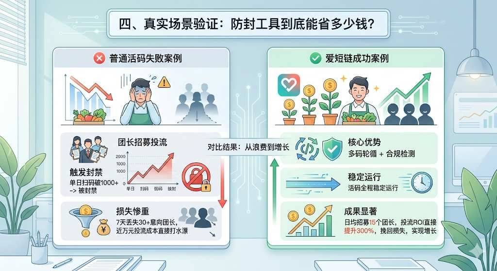 某社区生鲜商家用普通活码做团长招募投流,单日扫码破千后被封,7天丢失30 意向团长,近万元投流成本直接打水漂。 换成爱短链后,多码轮循 合规检测让活码全程稳定运行,日均招募15个团长,投流roi直接提升300%,把之前的损失全赚了回来。