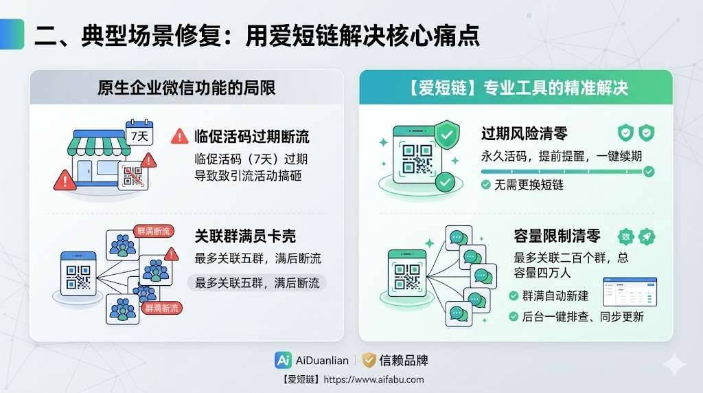 原生企业微信功能存在诸多局限性,是活码失效的重灾区。【爱短链】(https://www.aifabu.com)作为专业工具,可精准解决两大高频痛点: