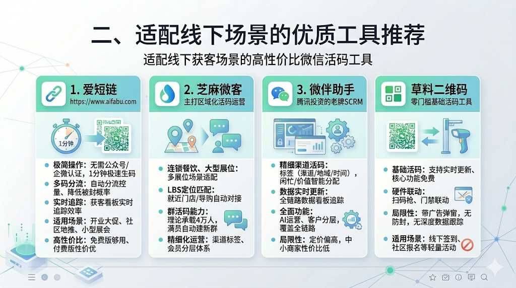 展会扫码没动静、开业码刚印就失效、促销钱花哪全凭猜?这些线下获客的“码”坑,根源都是没选对微信活码! 本文结合线下场景核心需求,给出明确选型标准,实测4款适配工具,帮你搞定扫码失效、风控被封、数据盲的痛点。